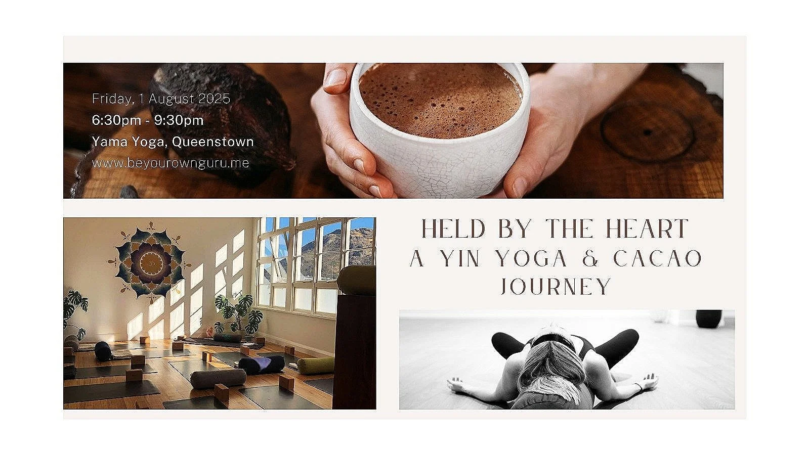 Join us for a beautiful 3-hour Yin session where we begin by sharing ceremonial Cacao—a gentle heart opener to invite stillness, connection, and presence. From here, we’ll move into a heart-centered meditation and a deeply restful Yin Yoga practice, supporting your body, mind, and spirit to soften, realign, and return to inner harmony.